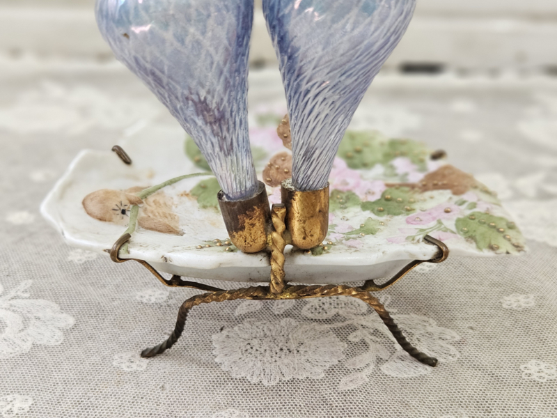 Antieke houder voor ringen, kettingen e.d., gemaakt van biscuit porselein met aan de achterzijde twee vaasjes met luster. Door het luster onstaat een mooi iriserende werking. Het schaaltje is in goede staat en heeft fraai zachte tonen.