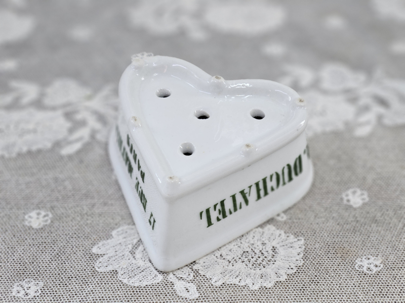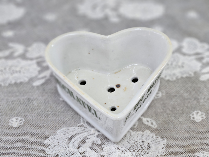 Bijzondere kaasmal met de naam van de maker óf verkoper erop. De mal is in de vorm van een hart en in goede staat.