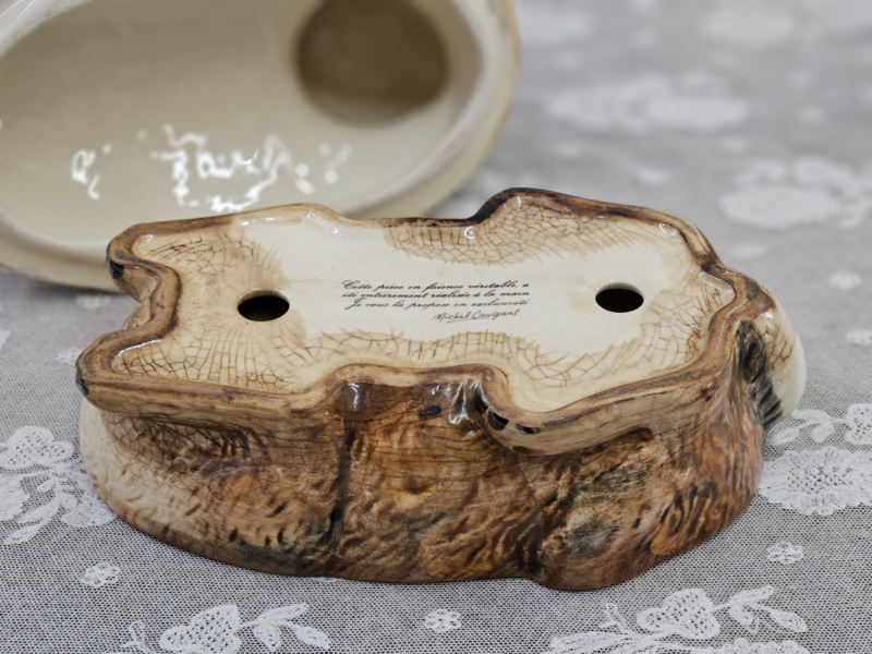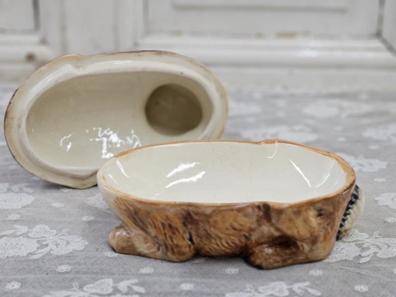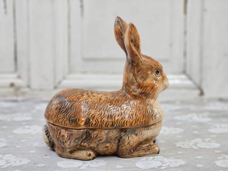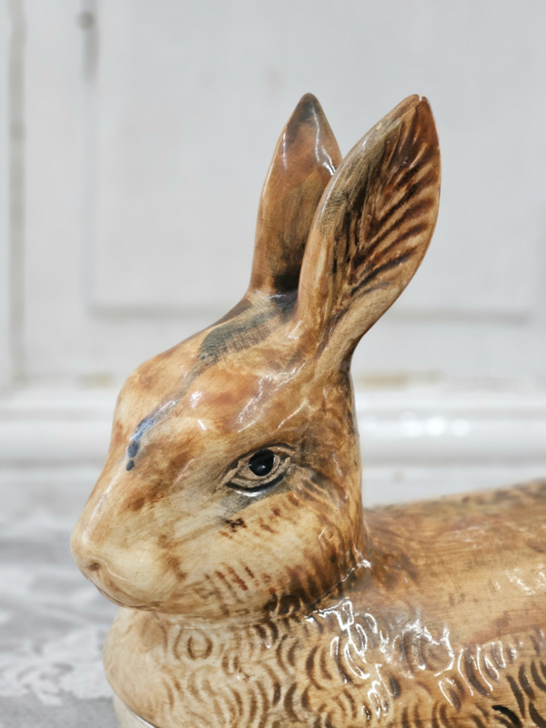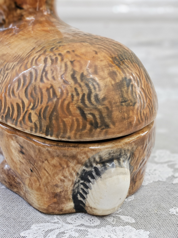 Een parmantig haasje in goede staat. Oh wat blijven ze aandoenlijk. Mini, mini schilfertje aan de onderkant en de bodem is beboterd.