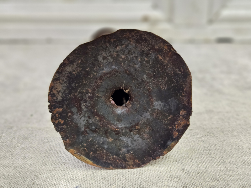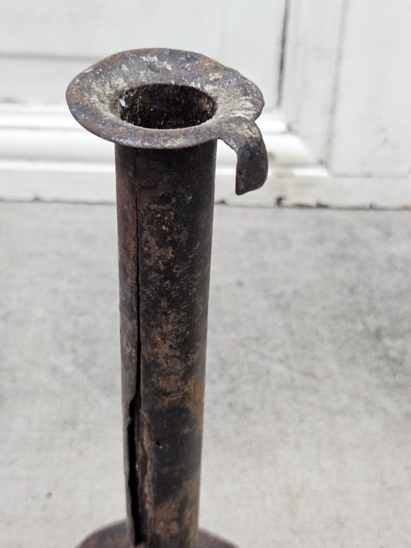 Hoge blikken kandelaar met de onmiskenbare Franse charme. De randen zijn wat sleets.