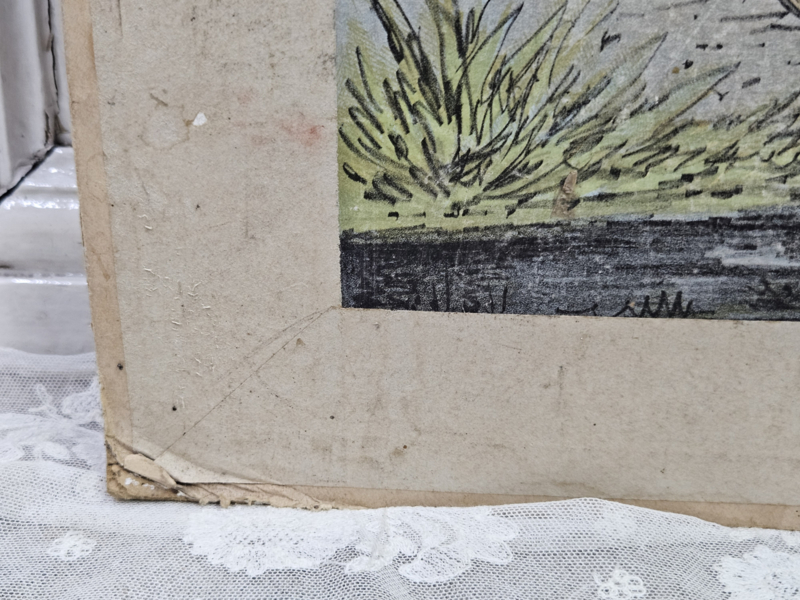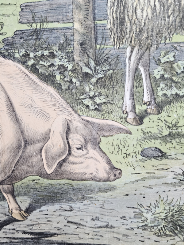 De kleurencombinatie in samenhang met de dieren maakt van deze plaat een feestje. Plaat is heel oud, dus de hoeken zijn een beetje verkneuterd. Langs de randen een aantal vochtplekjes.