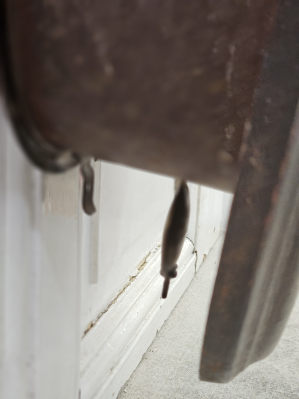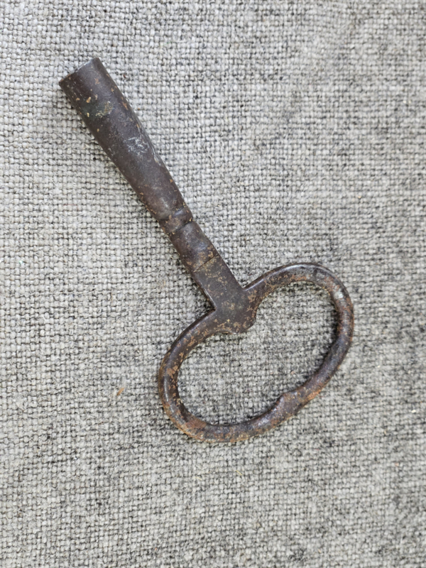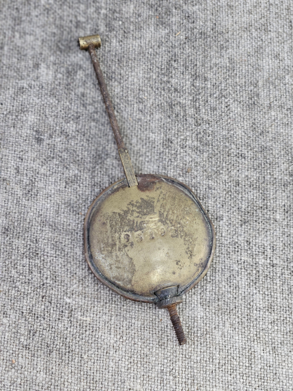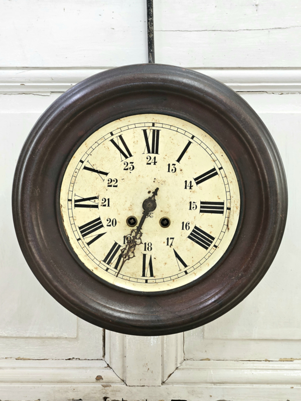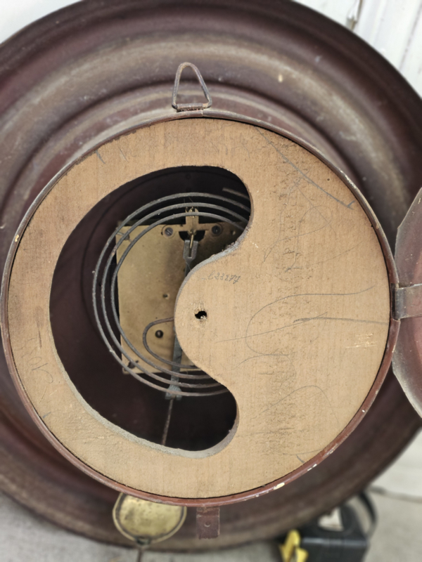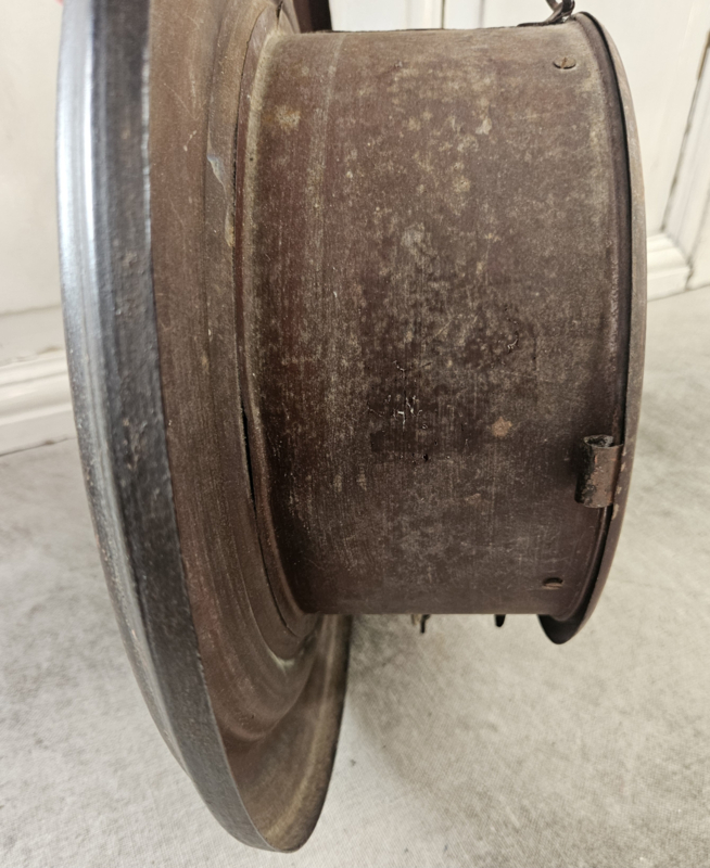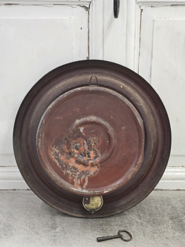 Franse keukenklok van blik met slagwerk, sleutel en slinger zitten erbij. De klok werkt, maar weet niet of deze op tijd loopt.