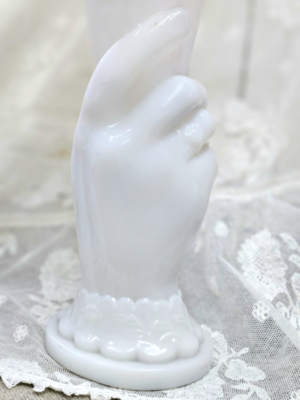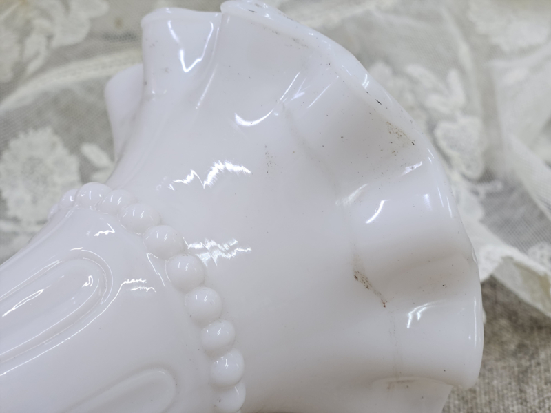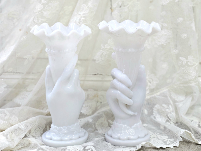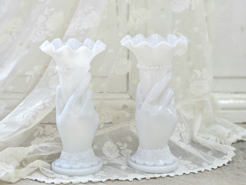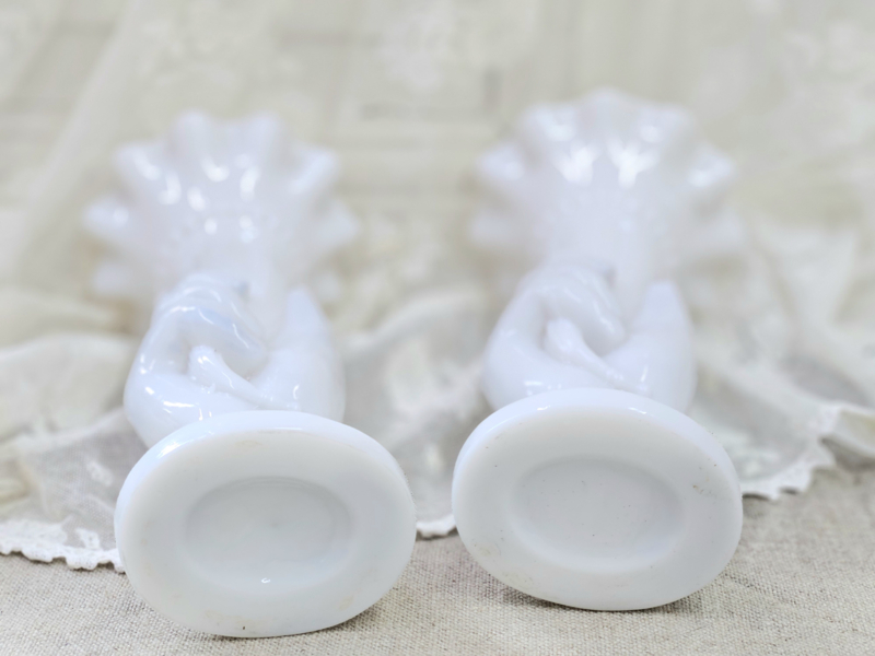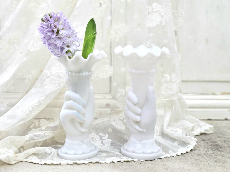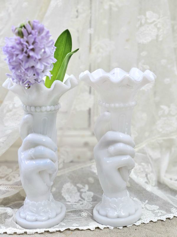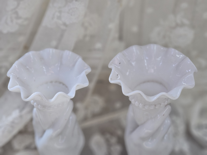 Twee oude vaasjes van wit persglas: een echt verzamelobject. Zo mooi ook dat het een setje is. Geen chips en/of barstjes. De ene heeft aan de onderrand een beetje zwartigheid (zie foto), maar volgens mij is dat met een goede poetsbeurt weg te krijgen. Het ene vaasje is net ietsje hoger dan de andere.