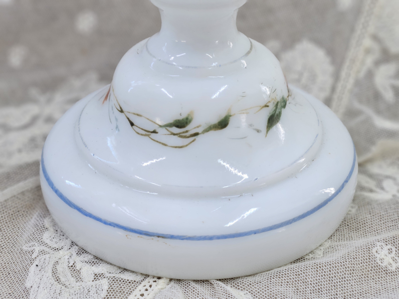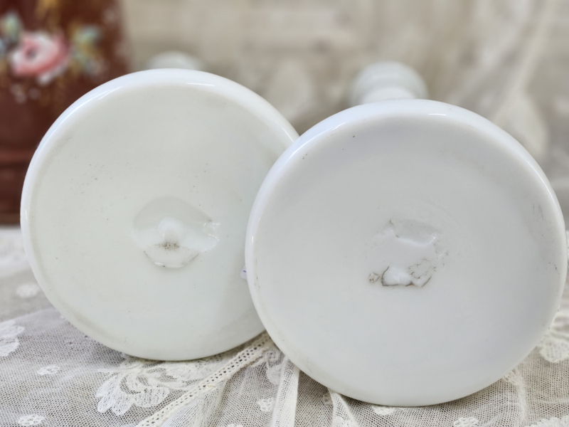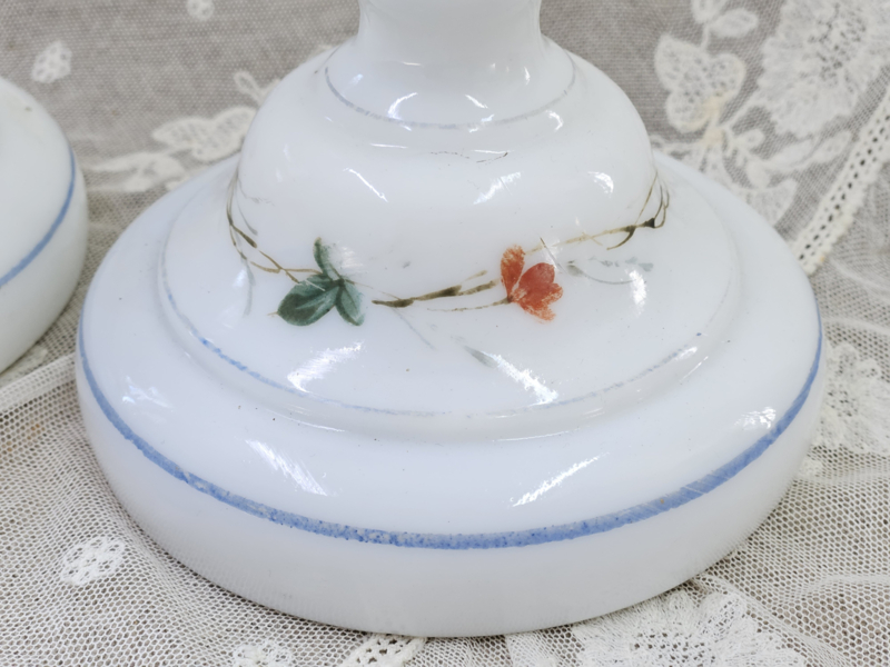 Unieke set antieke kandelaren van melkglas met handbeschilderd bloemendecor. Vermoedelijk eind 19e eeuws. Geen chips. De beschildering is her en der wat vervaagd. De kandelaren zijn massief, dus zeer stabiel en solide.