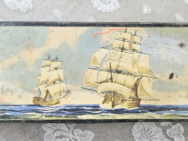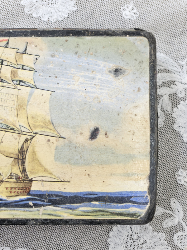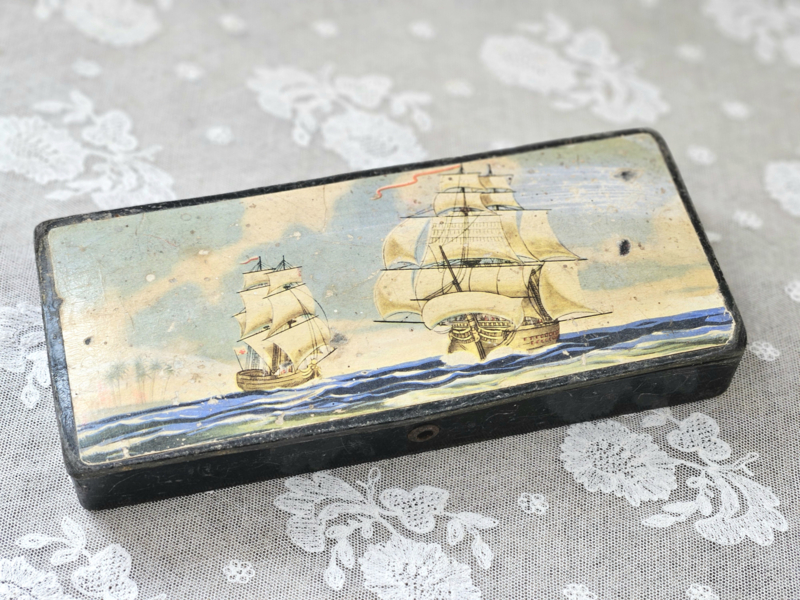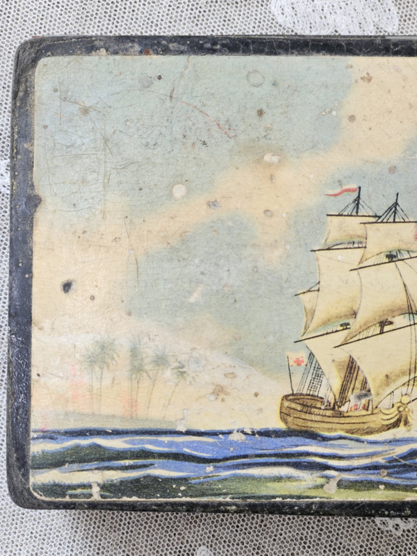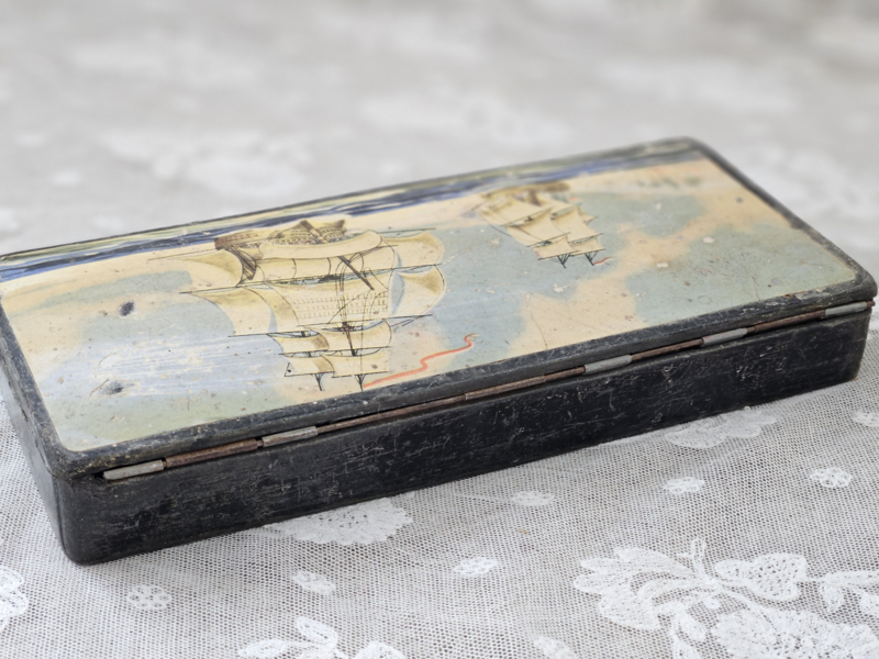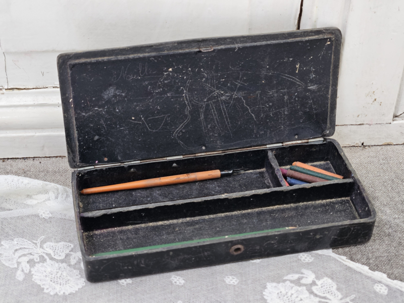 Antieke griffeldoos van papier- maché. In stevige, maar gebruikte staat. Niet storends.