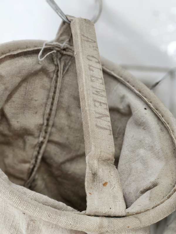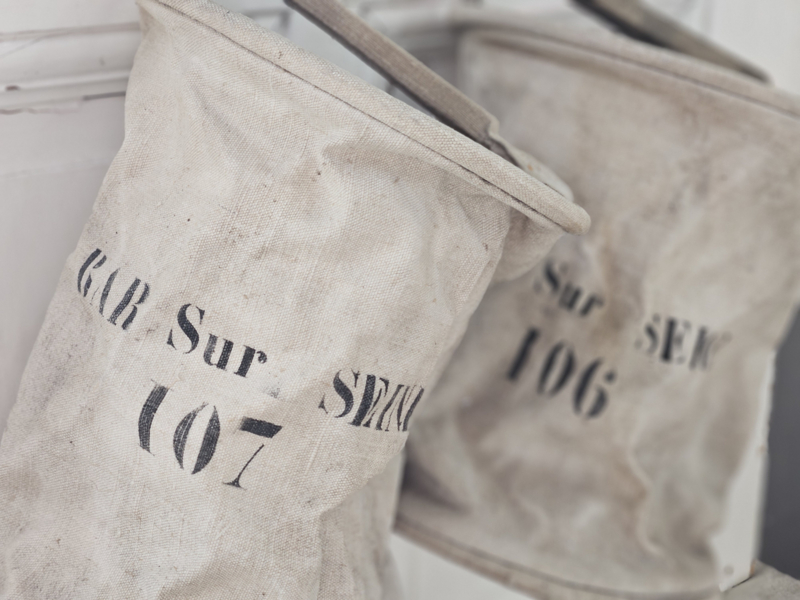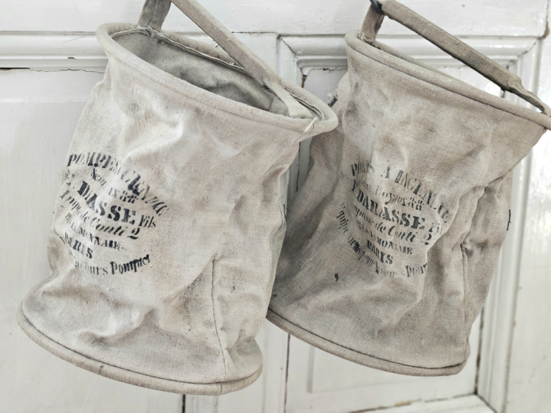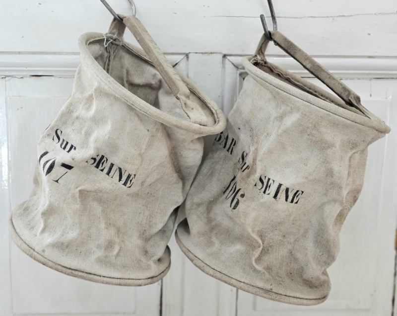 Oude waterzakken voor noodgevallen, deze komen uit Bar sur Seine, het noorden van de Bourgogne. Naam van de oorspronkelijke eigenaar staat op de handgreep. Het gaat om nr. 106 & 107, de prijs is per stuk. Leuk om op te hangen aan een regaal of laddertje met bijv. droogbloemen erin. Of gebruik ze als wasknijperzak.