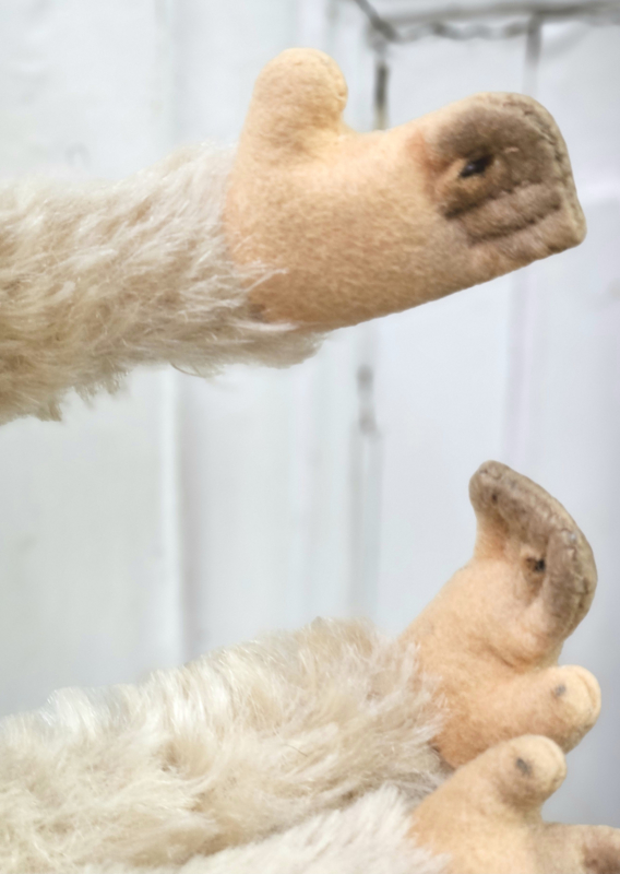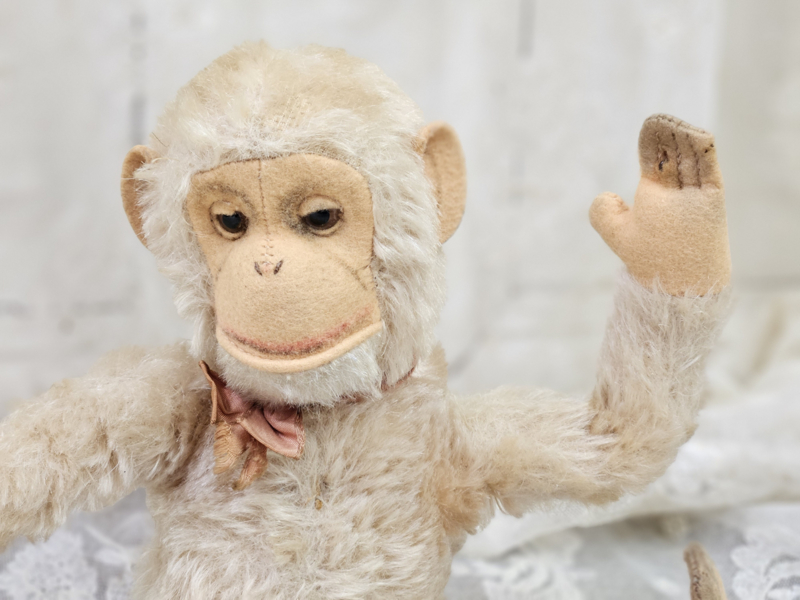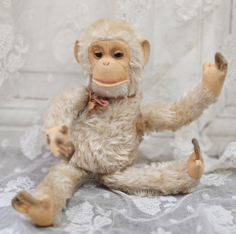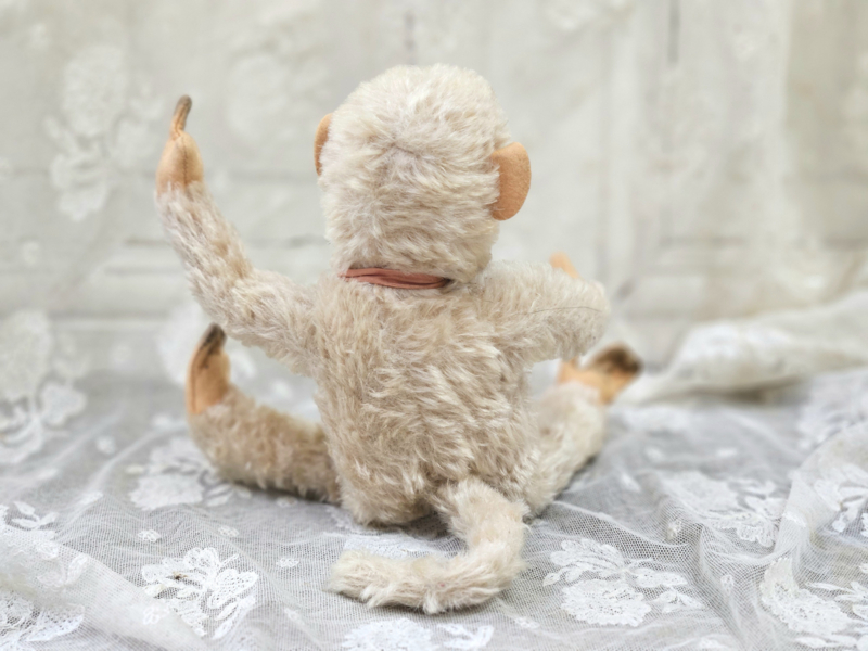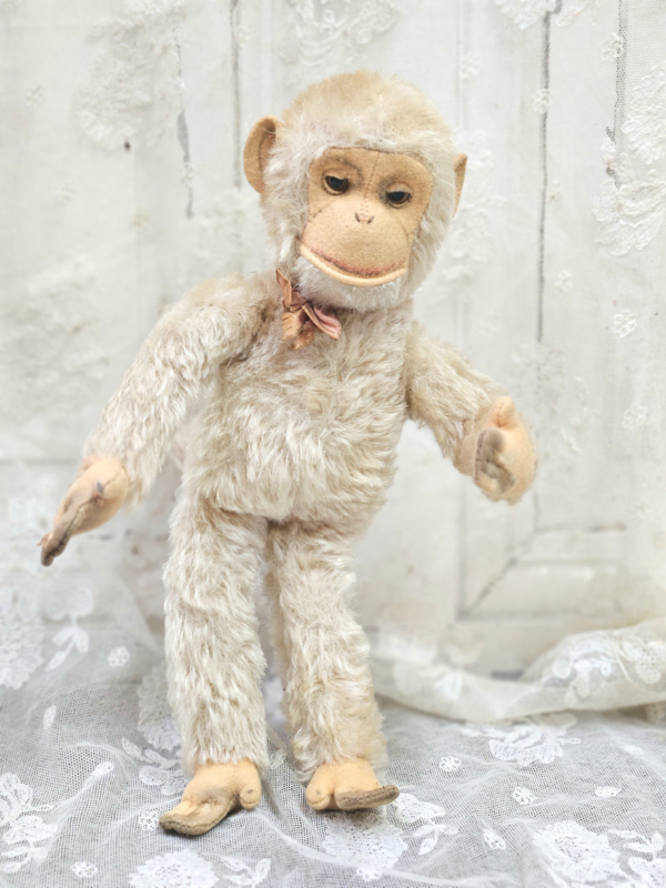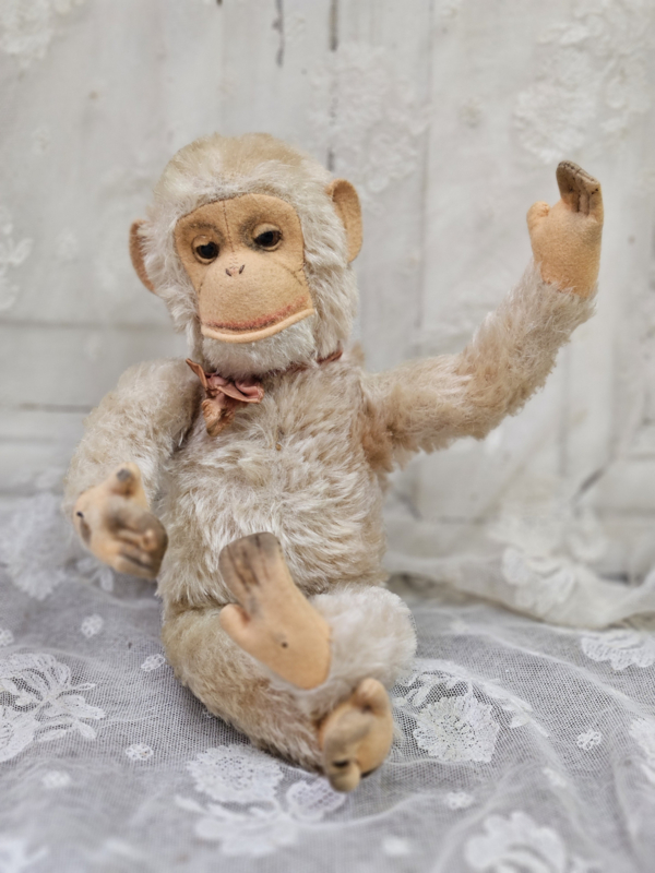 Dit oude aapje is een echte gymnast. Door het ijzer in zijn lijfje (zelfs in zijn staart) kan hij veel koddige poses aannemen. Er is mee gespeeld, de handen en voeten zijn ietwat gevlekt en het ijzer zie je daar ook een beetje. Maar schuift er niet uit. Gewoon een tof aapje. Aapje is gevuld met zeegras of iets dergelijks.