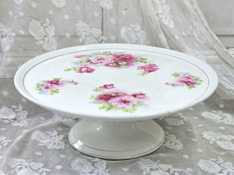 Taartschaal rozenEen blijmakertje! Anders kan ik het niet omschrijven, krijg er een vrolijk gevoel van. Antiek, blind nummer en een serienummer. De schaal heeft her en der een beetje craquelé door de ouderdom. Daarnaast zitten er op de opstaande…
