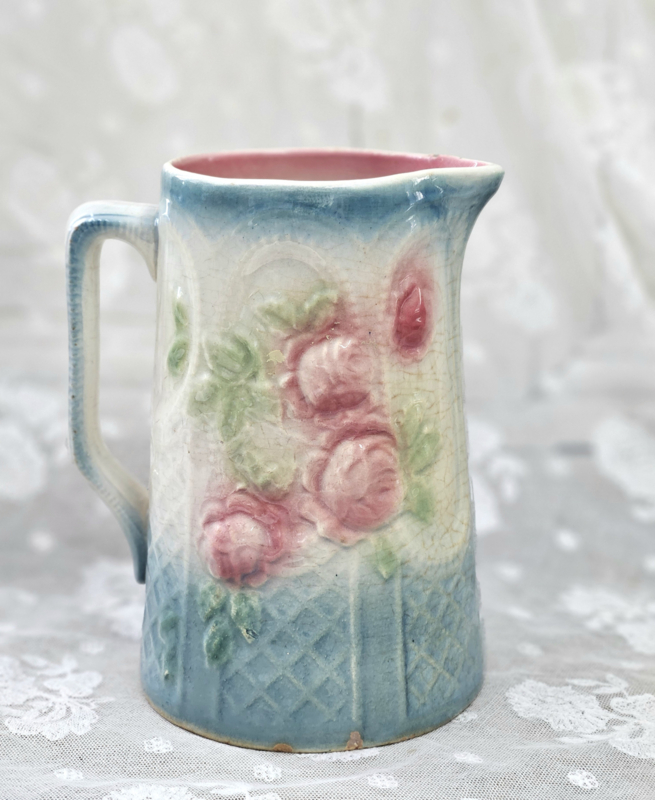 Sierlijke kan RegoutAntieke kan van P. Regout, Maastricht met sierlijke lijnen en reliëf. De bloemen zijn bruinrood van kleur en de onderzijde is zeeblauw/groenachtig. Geen chips, alleen een spinnetje op de bodem.