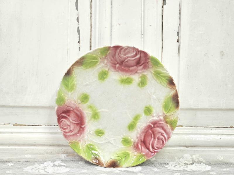 Barbotine bord oudroze roos VERKOCHTOud barbotine bordje met rozen, in een beetje de oudroze tint. Twee hele miniscule glazuursprong plekjes langs de zijrand. En twee, wederom, miniscule haarlijntjes. Bordje is een beetje beboterd.