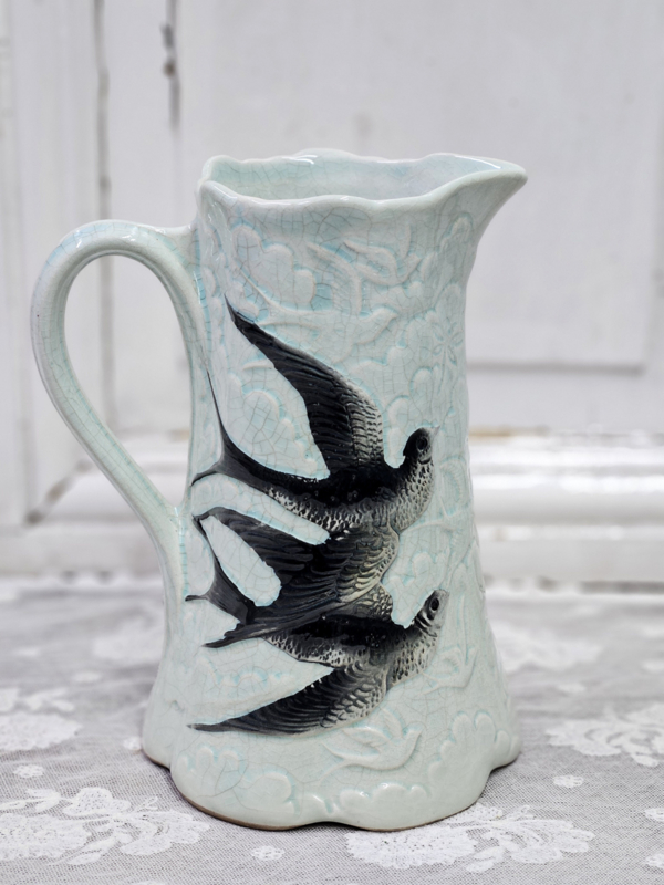 Barbotine kan 'zwaluwen'De eerste keer dat ik deze kan spotte en heb kunnen inkopen, wow.....een plaatje. Zwaluwen in kleur & reliëf en tevens op de achtergrond. De kan heeft ouderdomscraquelé. Geen chips en/of haarlijnen.